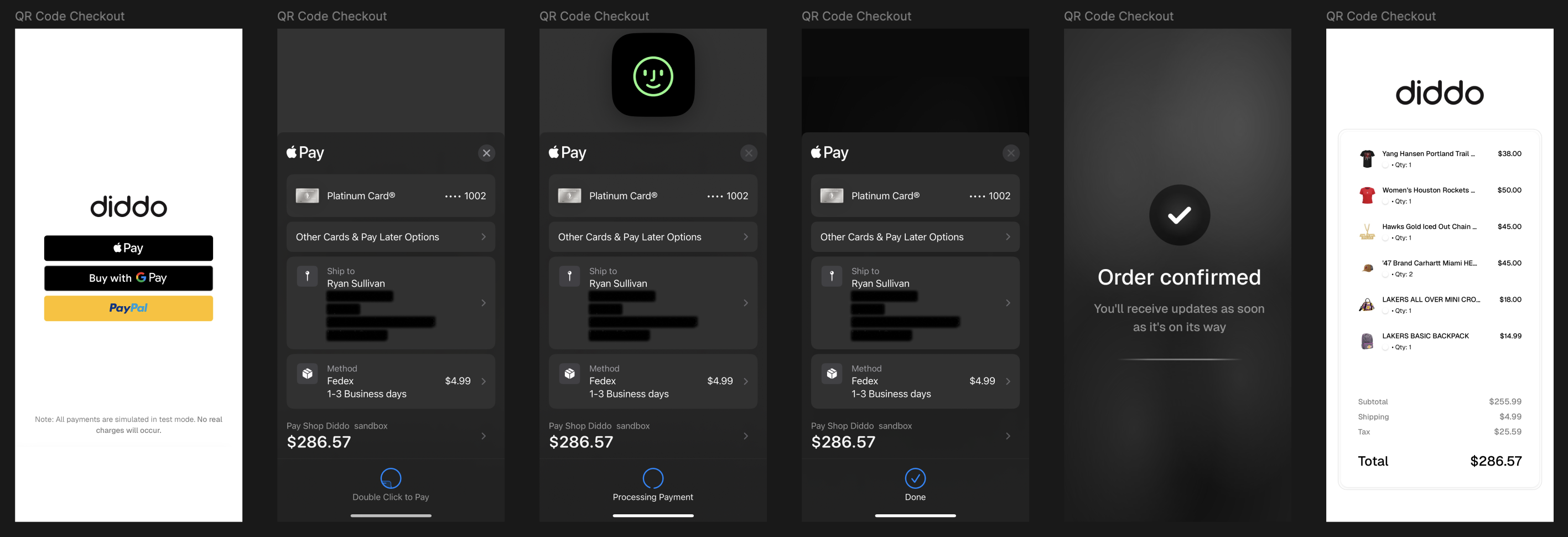 Scanning launches a Diddo-hosted checkout page on their device where they can complete payment with Apple Pay, Google Pay, or PayPal.